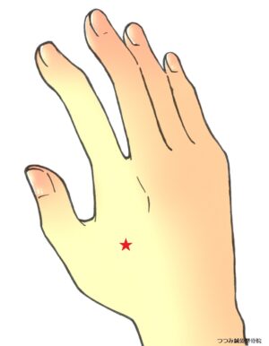 - 場所:手の甲、親指と人差し指の骨が交わる手前のくぼみ